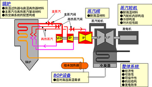 为了实现A-USC的实用化,东芝正在开展各项研发工作,包括可耐受700℃蒸汽高温的材料开发、以及能带来更好的稳定性和经济性的系统及结构方面的改良。