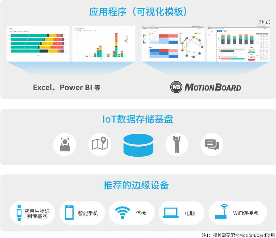 可自动收集工人的活动数据并进行行为分析。通过佩戴在手臂上的腕带式传感器根据加速度数据估算出四种运动(手工作业、推车移动、静止和行走)*。这些数据可通过智能手机传输到电脑,以确认工人的行为并优化其工作量。