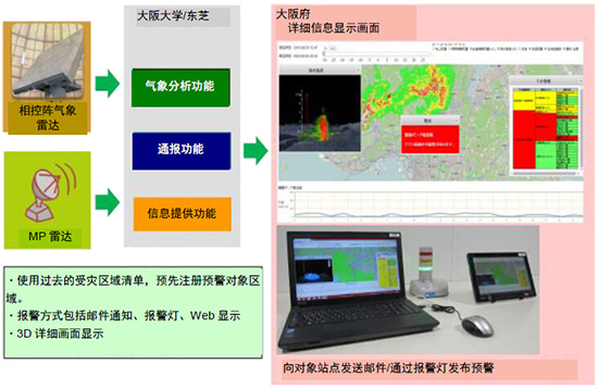 在本次实证实验中,研究人员将使用能够在30秒内对导致突发性暴雨的积雨云形成过程进行立体观测的相控阵气象雷达和能够精确观测降雨量的MP雷达(注2),通过对二者数据的分析,提前预警突发性暴雨。并将结果以电子邮件的形式报告到大阪府防汛部门以及在各相关站点设置的系统,并通过报警灯发出预警。本系统将在大阪府内的10个站点运行,以验证预防洪涝灾害的有效性。