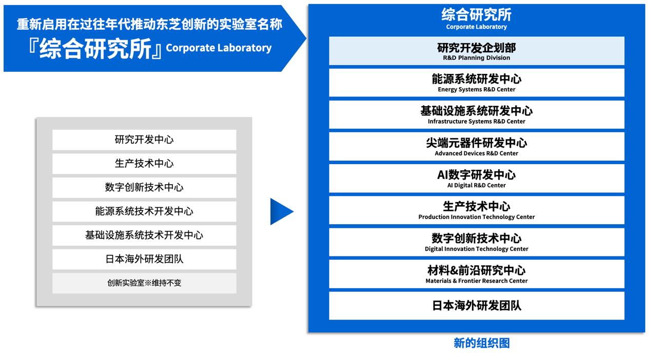 东芝将于2025年4月1日成立新的“综合研究所”。此前,东芝集团的三个“集团实验室”(Corporate Lab)负责从集团整体角度制定长期技术战略,并开展前沿和基础技术的研发;而两个“工厂实验室”(Works Lab)则专注于与业务直接相关的应用和产品技术研发。此次,东芝将这五个实验室整合为“综合研究所”,并在其下设立七个研发与技术中心。
