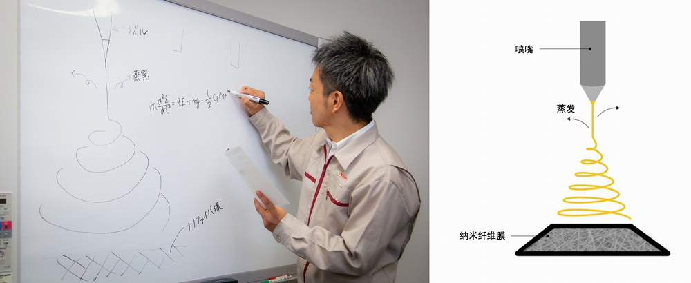 “将ES技术应用于产品,需要使用多个喷嘴、高速形成纳米纤维。但是,如果增加喷嘴,那么分别施加的电压会互相干扰,无法形成均匀的纳米纤维。只有彻底了解这“20cm的过程”,才能够稳定地批量生产纳米纤维。”(植松先生)