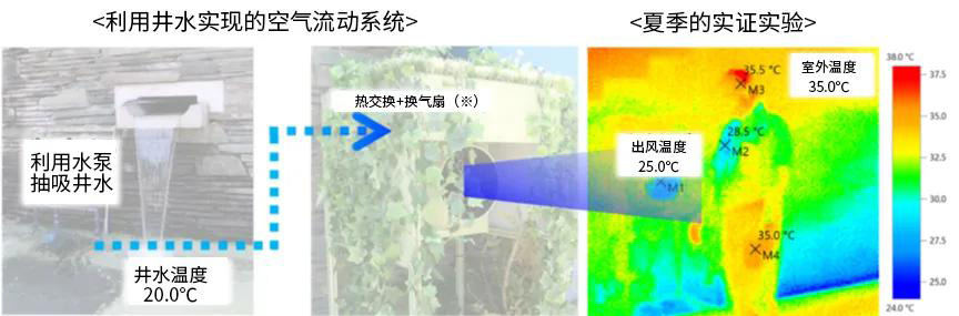 ※空调通常使用氟利昂之类的制冷剂,但本实验使用的是清凉井水,通过抽吸井水,并使用换气扇传送凉风。