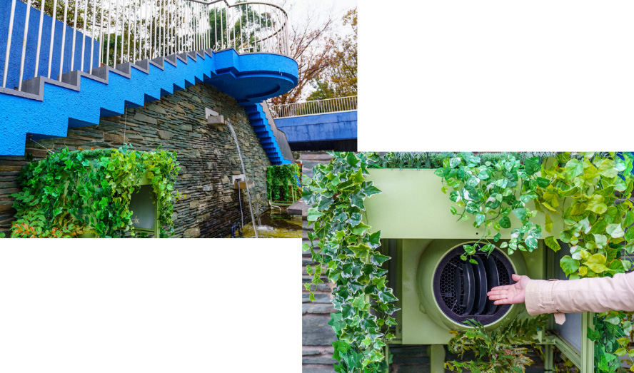 无需天花板管道,安装自由度大是“FLEXAIR2”的一大特点。在本次实验中,空调系统被安装在了原本是死角的喷泉周围柱子上。由于送风口的轮盘可左右自动摇摆,将风向外输送到更大的范围,所以即便在室外也能保持自然舒适。为了将观景台打造成绿洲,大渕先生在安装设计时十分注重清凉感、舒适感,目标是带给游客仿佛置身于大自然中的感觉。