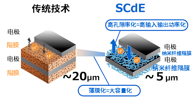 除NTO外,东芝为了推进SCiB™的发展还引进了一项新技术——Skin-Coated Electrode(SCdE)。SCdE是一种新型隔膜结构,是指覆盖在电极材料表面上、由树脂制成的超薄纳米纤维膜,可以分隔阴阳两极。通常,这种阴正极绝缘的隔膜采用厚度约为20μm的独立膜。而东芝采用的是独有的电极一体化隔膜,可成功将薄膜厚度减至5μm左右。