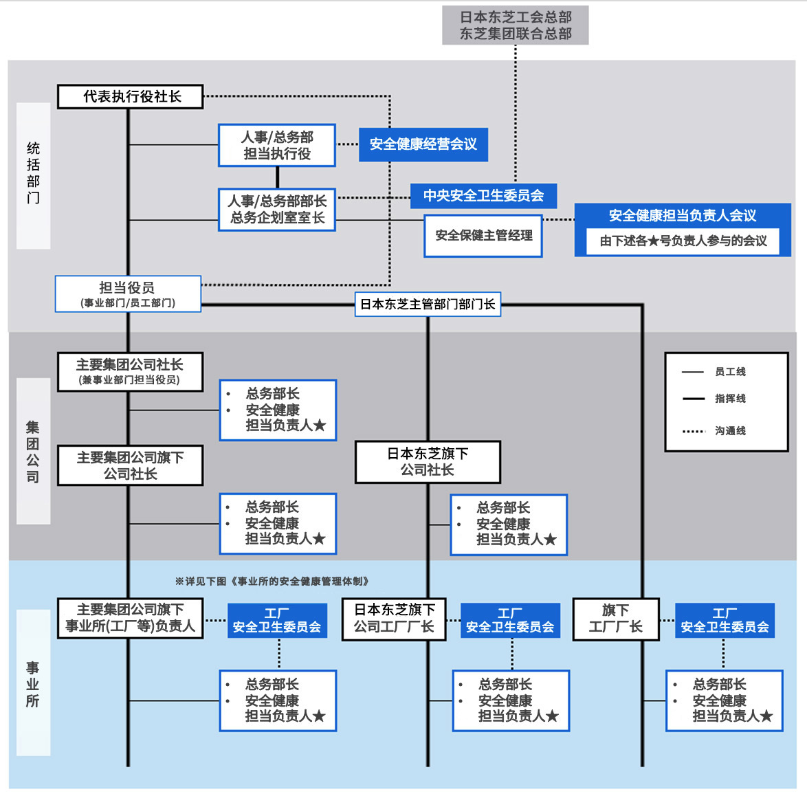 东芝集团的安全健康管理活动采取“从经营高层到普通员工的分级管理”模式,将集团统筹部门的措施通过各集团公司加以落实,以各事业所(或集团公司)为单位开展具体的安全健康管理活动。