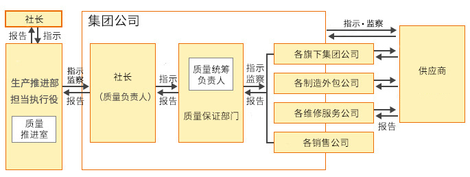 东芝集团质量保证活动的实施推进体制是:由“生产推进部担当执行役”和“质量推进室”对集团进行统一管理,由集团公司负责人对其公司每个产品、每项服务负责。从产品企划、开发、生产到废弃、再资源化,在整个产品生命周期都注重提升产品质量,由各主要的集团公司的“质量统筹负责人”对所管辖的日本国内外事业所(制造基地)、供应商、维护服务公司、制造外包公司进行指导与监督检查。