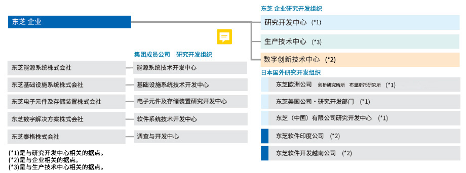 东芝集团的研究开发体制由集团(总部)的研究开发部门、集团内公司的研究开发部门及设计&技术部门组成,各部门分工协作,高效推进。集团研发部门从中长期的角度深化基础技术,致力于新业务领域的研究、进行创新性和前瞻性研发。