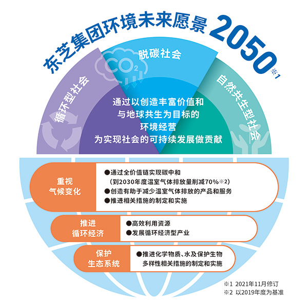 在各种情况不断变化的背景下,东芝认为,为了能为实现社会的可持续发展做出贡献,同时实现企业自身的可持续发展,从长远视角出发,顺应全球趋势并持续提供丰富的价值至关重要。为此,东芝集团于2020年11月制定了立足全球视角、涵盖应对碳中和和循环经济等课题的全新长期愿景——“环境未来愿景2050”。该愿景旨在“通过以创造丰富价值和与地球共生为目标的环境经营,为实现社会的可持续发展做贡献”,致力于实现可持续发展的社会,即脱碳社会、循环型社会和自然共生型社会。东芝延续了自2007年制定前一版愿景时所采用的“回溯法”※2理念,朝着2050年的“理想状态”,在“重视气候变化”、“推进循环经济”和“保护生态系统”这三个领域积极推进相关工作。2021年11月,东芝又对愿景进行了修订※3,在“重视气候变化”方面,进一步加速了在整个价值链中为实现碳中和所采取的行动。