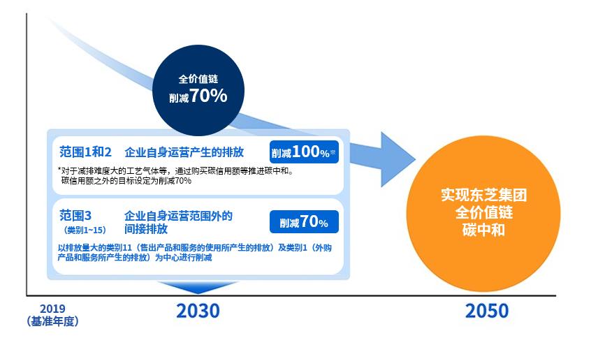 ※3 2020年11月制定的 “重视气候变化” 愿景:“通过整个价值链为实现社会的温室气体净零排放做贡献(到2030财年将东芝集团自身价值链的温室气体排放量减少50%)” 2020年11月修订的 “重视气候变化” 愿景:“通过整个价值链实现碳中和(到2030财年将温室气体排放量削减70%)”