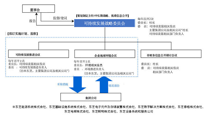 自2003年起,东芝集团就设立了可持续发展推进部门,完善了全集团的推进体制。并于2021年4月成立了可持续发展推进部,将可持续发展的观点融入管理,通过企业活动推动ESG(环境、社会和公司治理)、SDGs(联合国可持续发展目标)。并对以往的可持续发展推进体制进行了调整,新设立了可持续发展战略委员会,适时制定东芝集团可持续发展战略与目标。