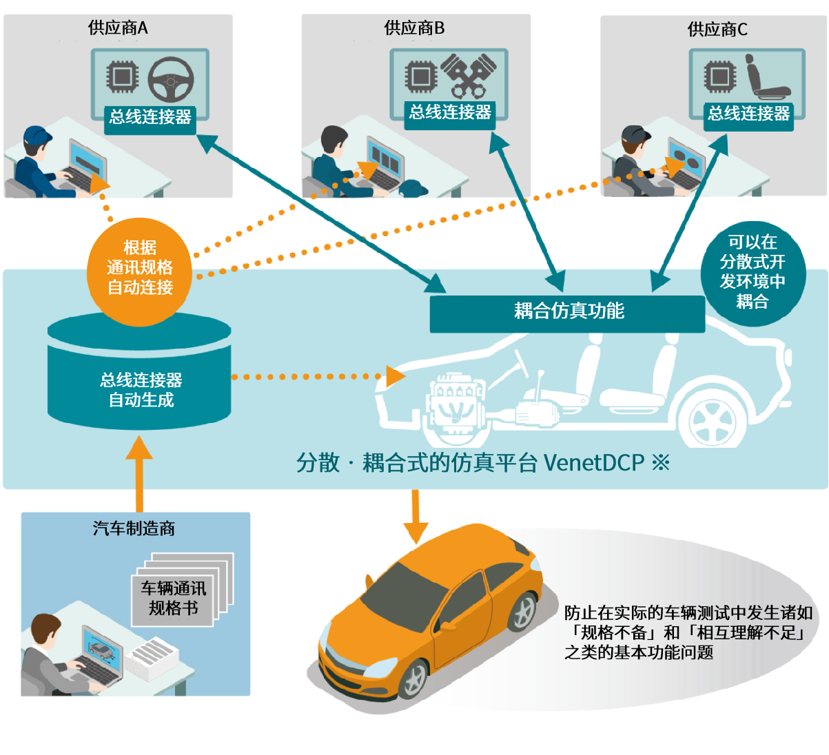 为了更广泛适用于已在汽车制造商及供应商中普及推广的基于模型的开发方式,VenetDCP将大部分模型、不同开发工具、不同企业联系在一起,提供可以基于网络平台的协同验证环境。这样一来,使用者便可以提前实施诸如自动驾驶以及ADAS这种需要协同多个子系统,且车载环境验证极为复杂的项目,实现品质改善,大幅度提高生产效率。