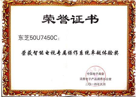 【2014年9月26日】9月24日,中国家电业盛会——“2014年中国家电产品智商评测结果发布会暨高智商(门萨中国)俱乐部成立仪式”在北京举行。东芝电视-50U7450C在家电产品智能评测中达到八级标准,凭借便捷的操控性、稳定的操作系统、强悍的硬件配置而一举拿下“智能电视专属智能操作系统卓越体验奖”。同时,该款产品也成为首批入选中国家电产品高智商(门萨中国)俱乐部成员。