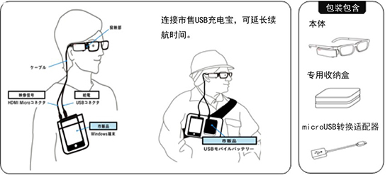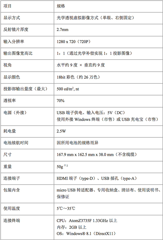 新产品重50g注2,尺寸为167.9mm(宽)x162.5mm(深)x38.0 mm(高),避免了由于长时间佩戴对眼部产生的压力,让佩戴者感受到眼镜带来的轻便舒适。同时,新产品采用与普通眼镜类似的平滑设计,佩戴后不会给人带来另类的感觉。采用设置在侧后方的特有光学投影方式注3,保证了佩戴者拥有更加宽广的视野。并且,搭载可调节投影角度的PA装置(个体调节器),可应对不同的面部形状和两眼间距。