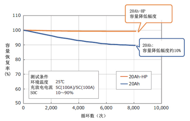 由于内阻降低,连续充放电时的发热量也随之减少,实现了比能量型20Ah电池更长的使用寿命。例如,经历8000次充放电循环后,能量型20Ah电池容量下降约10%,而“20Ah-HP电池”容量下降幅度十分微小。*2